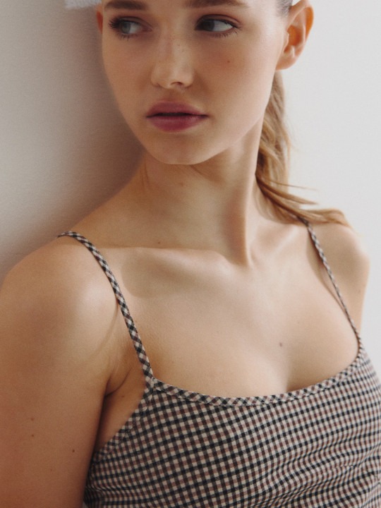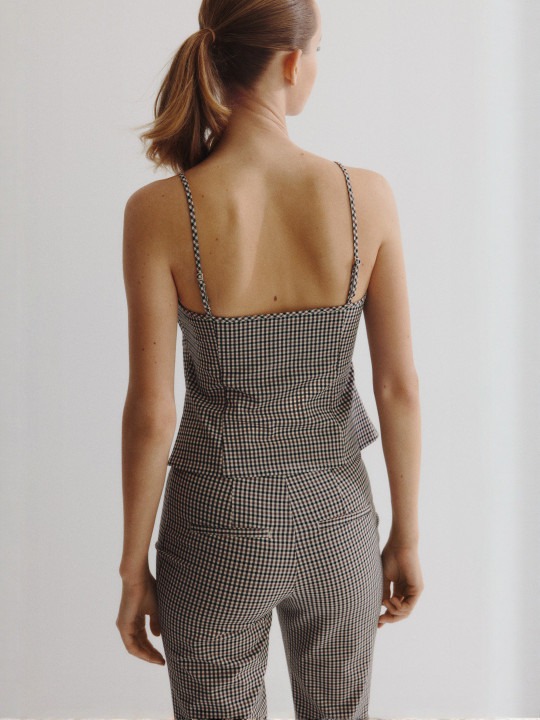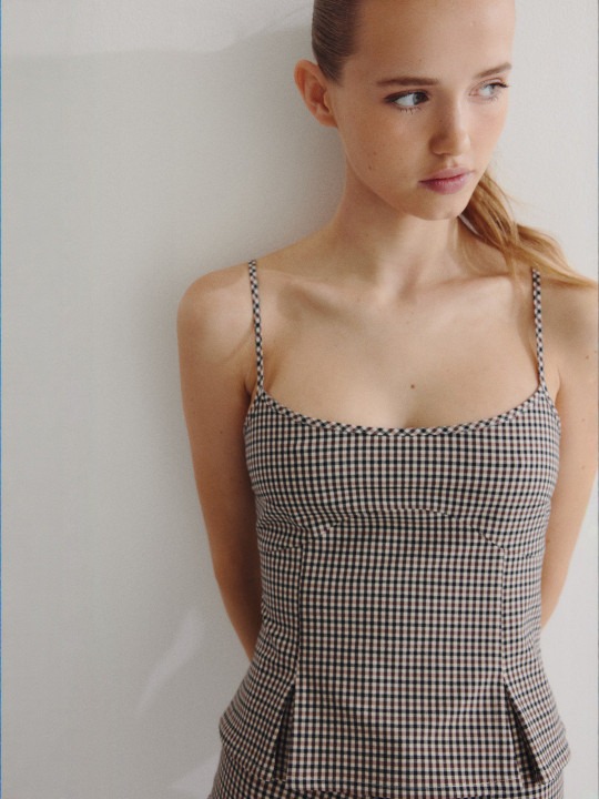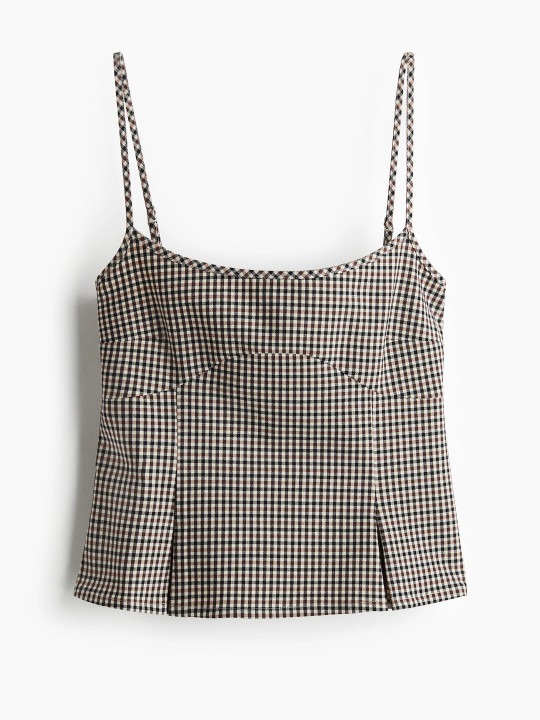 Fitted top in woven fabric with adjustable, narrow shoulder straps. Visible seam below the bust and two seams down the front that turn into inverted box pleats at the hem.